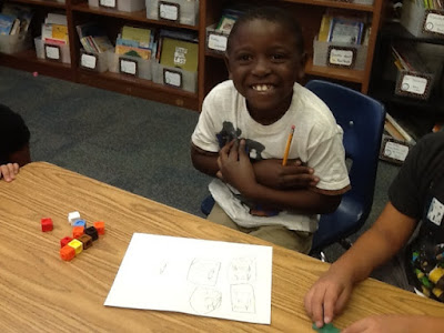 Another thing we are working on in this unit is modeling math equations. We played "Bears in a Cave" one day. Students took turns hiding some of their 10 bears in the "cave" and their partners had to figure out how many bears were under the cup and write the number sentence (as an addition problem).